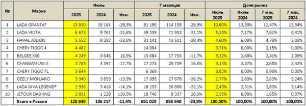 Главная | АВТО | Авторынок РФ в июле: лучший результат 2025 года, среди бестселлеров – Tiggo 7L и Dashing