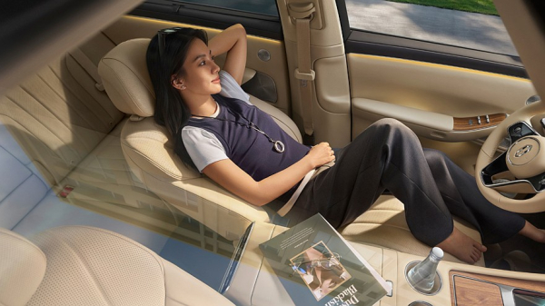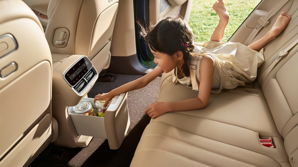 Ручки дверей с внутренней стороны заменили на кнопки, кроме того, в салоне можно разглядеть декоративные вставки из дерева и пару больших подстаканников на центральном тоннеле. Ожидается, что второй ряд сидений получит функции вентиляции и подогрева.