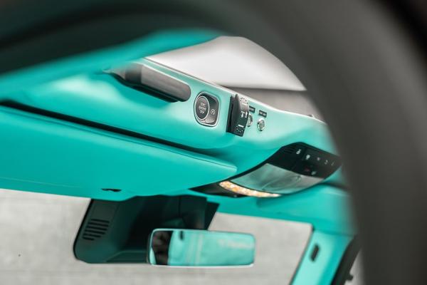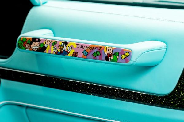 Салон Mansory Art Piece AL3C MONO907Y имеет полностью новую кожаную обивку из стёганой кожи, большое количество вставок из углепластика, разноцветные ремни безопасности, разноцветные дефлекторы системы вентиляции и, конечно же, авторские штрихи и картинки от Алека Монополи. Кнопку запуска двигателя Mansory по традиции переносит под потолок, то есть в данном случае на верх рамки лобового стекла.