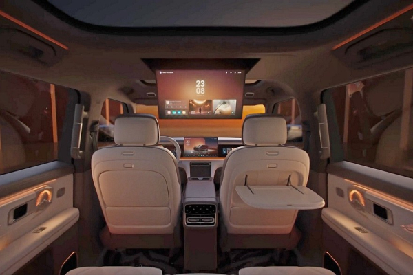 В шестиместном салоне – три экрана на передней панели и двухспицевый руль. Боковые дефлекторы обдува сделали вертикальными. На центральном тоннеле расположены беспроводная зарядка, пара неприкрытых подстаканников, физические клавиши и «хрустальные» шайбы. В торце тоннеля – сенсорная панель для основных настроек. У задних пассажиров есть свой, «потолочный», развлекательный дисплей. В спинки передних кресел встроены откидные столики.