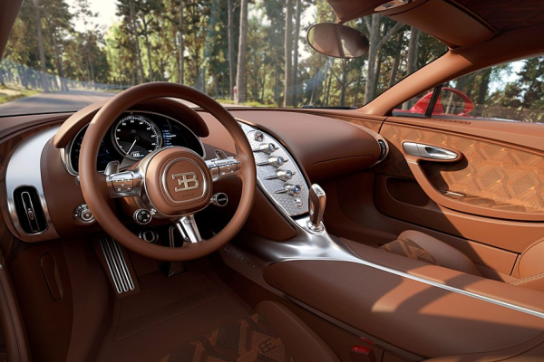 Салон тоже полностью переделан, хотя в нём сохранены основные компоновочные решения Вейрона, некоторые детали позаимствованы у моделей Chiron и Mistral. Центральная консоль стала у́же и изящнее, на её металлической поверхности разместился вертикальный ряд круглых регуляторов, а на самой вершине находятся уникальные часы с автоподзаводом, упакованные в металлический вьсьмигранный корпус. В щиток приборов добавлены настраиваемые многофункциональные экраны, но центральное место по-прежнему занимает большой стрелочный спидометр. Трёхспицевый руль новый, с металлическими сервисными клавишами и более крупными лепестками ручного переключения передач. Дверные карты тоже полностью переделаны — они, как и новые ковшеобразные сиденья, имеют комбинированную обивку из кожи и ткани ручной работы.