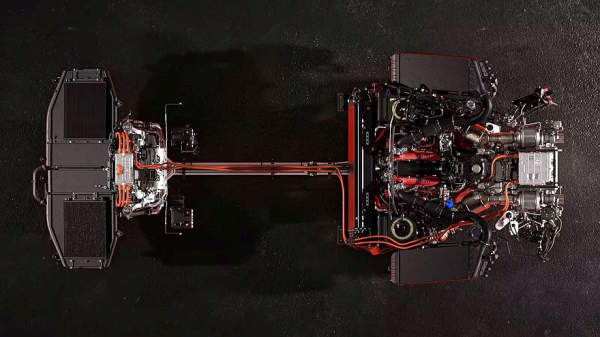 Три электромотора по-прежнему совокупно выдают 220 л.с., но рекуперация, как утверждается, стала более эффективной. Два электромотора вращают передние колёса, а третий вживлён между ДВС и коробкой передач. Ёмкость тяговой батареи, размещённой поперечно за сиденьями, уменьшена с 7,9 до 7,45 кВт·ч, но запас хода на электротяге прежний — 25 км. Предполагается, что ответственный владелец Ferrari 849 Testarossa, желающий поменьше нагружать природу углеродным следом, будет регулярно заряжать батарею от внешнего источника, но острой необходимости в этом нет, достаточный уровень заряда можно поддерживать за счёт генерации электроэнергии на борту. Максимальная совокупная мощность силовой установки Ferrari 849 Testarossa — 1050 л.с. (у SF90 было 1000 л.с.).