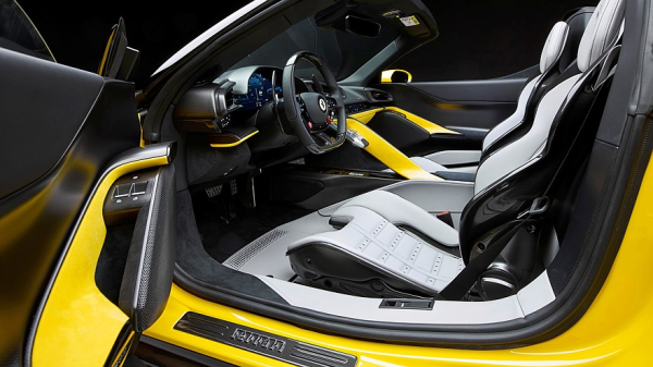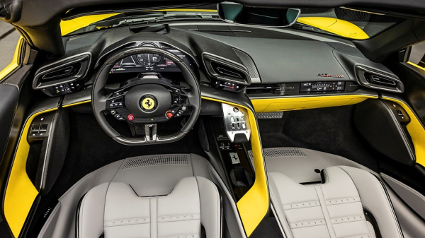В салоне Ferrari 849 Testarossa тоже «торчат уши» модели SF90, но эргономика стала немного лучше благодаря отказу на руле от сенсорных панелей в пользу обычных физических клавиш, притом что панели управления светом и микроклиматом остались сенсорными. Селектор режимов трансмиссии переехал вверх поближе к рулю и крепится к составной углепластиковой рамке, которая как бы опоясывает место водителя. Единственному пассажиру выделили собственный штурманский экранчик, на который выводятся основные динамические характеристики автомобиля. Объём багажника, расположенного в передней части кузова, — 68 л.