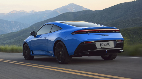 Корму новинки снабдили «монофонарём» с надписью в виде названия бренда по центру, интегрированным в кромку крыши стоп-сигналом, а также диффузором с синим разделителем по центру. По бокам от места для крепления автономера располагаются узкие горизонтальные светоотражатели. Отметим, по сути, модель представляет собой трёхдверный хэтчбек, так как багажник открывается вместе со стеклом, но в компании её позиционирует как купе.