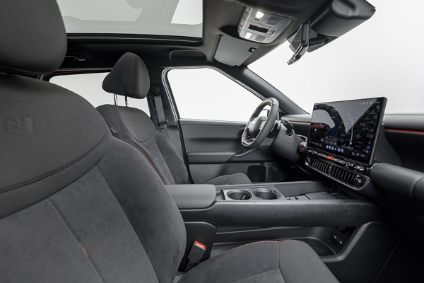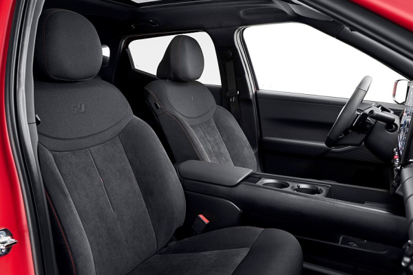 Ioniq 3 адресован молодым семьям, поэтому салон достаточно просторный, с множеством ниш для хранения вещей. Передняя панель представляет собой один большой карман с мягкой обивкой (решение, позаимствованное у Fiat Panda первого поколения). Узенький приборный экран находится над слегка сплюснутым рулём. Мультимедийный экран с операционкой Android Automotive OS может быть 12,9- либо 14,6-дюймовым, под ним разместился компактный блок микроклимата с физическими клавишами. В дорогих версиях будут двухзонный климат-контроль, мощная аудиосистема Bose, передние кресла с вентиляцией и богатый набор электронных ассистентов водителя. Объём багажника — 322 л плюс 119-литровое подполье, именуемое Megabox.