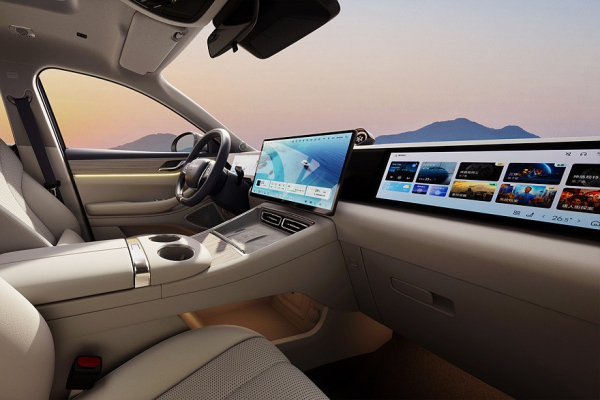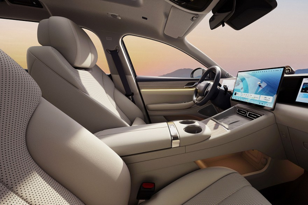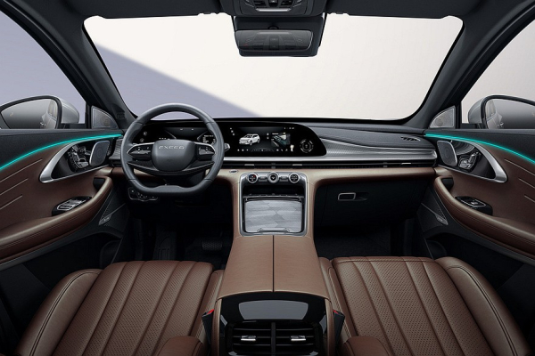 Отдельного блока управления «климатом» тут нет – все настройки вшиты в центральный планшет. На тоннеле – площадка для беспроводной зарядки, ряд физических клавиш и пара неприкрытых подстаканников. За управление трансмиссией отвечает подрулевой рычажок. Поверх передней панели еще находится некий элемент, но его назначение пока непонятно (китайские СМИ считают, что это часы).