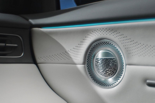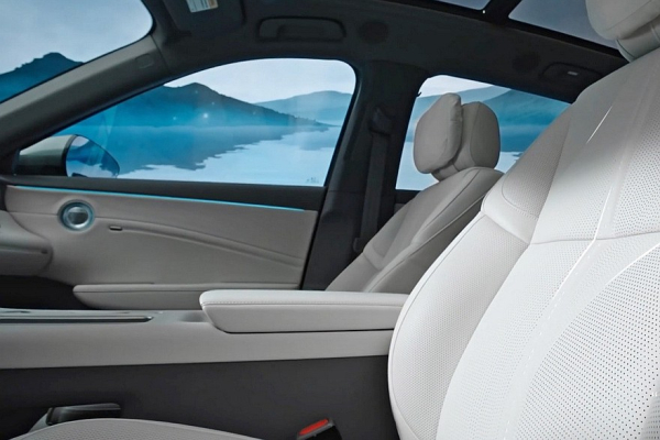 Кроссовер бывает только пятиместным. Внутри – узкий приборный экран и гигантское табло мультимедиа, которое состоит из двух тачскринов. Поверх передней панели установлен некий элемент с подсветкой – не то динамик, не то голосовой помощник. А, может, и то и другое. Вместо привычного селектора коробки – подрулевой рычажок. На центральном тоннеле находятся прикрытый крышкой отсек, площадка для беспроводной зарядки и пара подстаканников. В торец тоннеля встроен выдвижной ящик – скорее всего, с функциями охлаждения и подогрева.