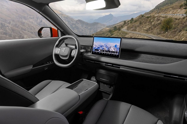 В салоне паркетника – лаконичная передняя панель, раздельные экраны приборки и мультимедийной системы (12,8 дюйма). Нашему «второму» Evolute i-Joy также обещаны панорамная крыша, обогрев лобового стекла, подогрев руля и передних сидений (водительское кресло – еще и с вентиляцией), беспроводная зарядка для смартфона мощностью 50 Вт (расположена на консоли между передними креслами).