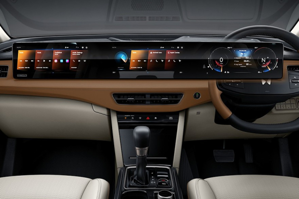Внутри паркетник повторил стартовавший недавно электрокросс Mahindra XEV 9S, который хоть и заявлен в качестве отдельной модели, но, по сути, представляет собой «зеленую» версию как раз XUV700/XUV 7XO. Топливному автомобилю достались аналогичные передняя панель, руль и расположенная под центральными дефлекторами обдува сенсорная полоска. А еще Mahindra XUV 7XO уже в базе имеет трехэкранное табло без козырька – каждый дисплей диагональю 12,3 дюйма (у старого XUV700 табло состоит из двух экранов под козырьком). Мультимедиа – с поддержкой ChatGPT.