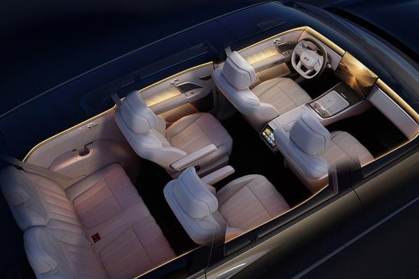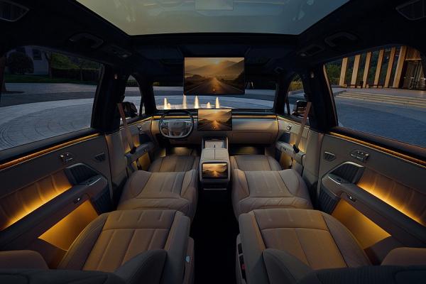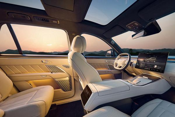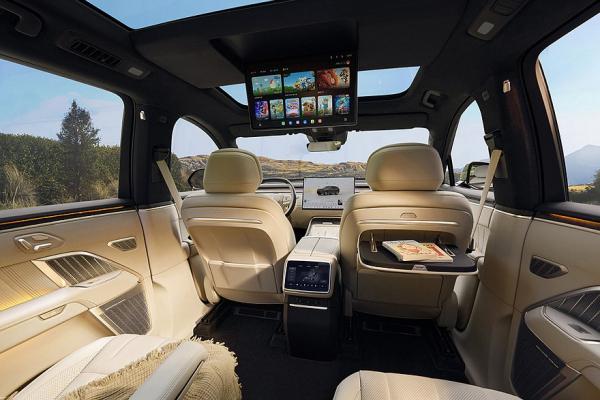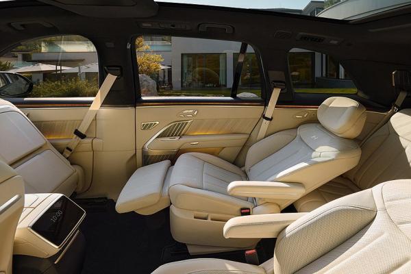 На центральном тоннеле есть две площадки для беспроводной зарядки смартфонов и пара неприкрытых подстаканников, а в его торец встроен тачскрин для пассажиров второго ряда. Еще один дисплей прикреплен к потолку. Расположенное посередине правое пассажирское кресло – с выдвижной подставкой для ног. В спинку переднего сиденья встроен откидной столик.