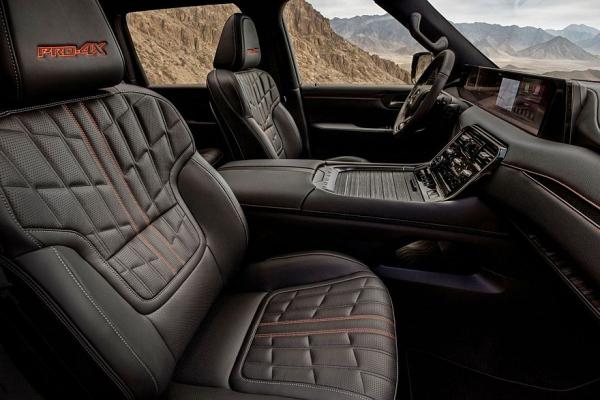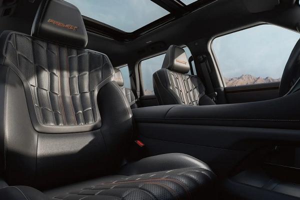 В салоне Nissan Patrol Pro-4X – черная кожаная обивка с контрастной прострочкой, на подголовниках кресел вышита эмблема суровой версии. В списке оборудования также значатся объединенные экраны приборки и мультимедиа (каждый диагональю 14,3 дюйма), панорамный люк, подогрев и вентиляция сидений, система Biometric Cooling (определяет, когда седокам первого и второго рядов жарко, после чего электроника сама регулирует температуру и направляет прохладный воздух) и множество водительских ассистентов.