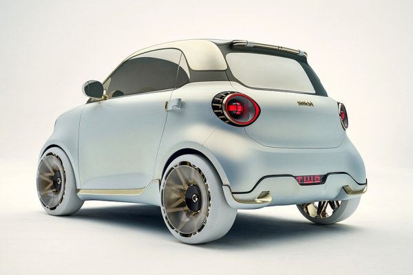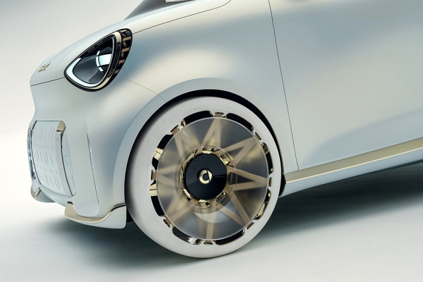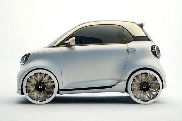 Smart Concept #2 выглядит словно модная сумка на колёсах, такие ассоциации вызывают позолоченная фурнитура, хлястики вместо дверных ручек, декоративные кожаные ремешки на переднем бампере, полупрозрачные матовые колпаки колёс и корпуса зеркал, белые шины (кажется, что они изготовлены из кожи) и основной нежный фарфоровый цвет кузова.