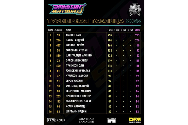 1 место – Ваге Акопян (Майами, BMW E46) – доказал статус лидера, одержав победу в финале после напряжённого противостояния.