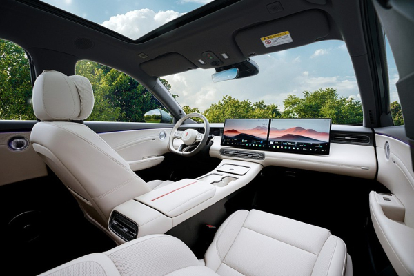 В пятиместном салоне HS6 установлены узкий приборный экран и гигантское табло мультимедиа, состоящее из двух тачскринов. На центральном тоннеле – прикрытый крышкой отсек, площадка для беспроводной зарядки и пара подстаканников. За управление трансмиссией отвечает подрулевой рычажок.