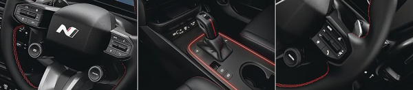 Отличия есть и в интерьере. Салон имеет отделку в чёрном цвете с контрастными ярко-красными вставками и прострочкой, в том числе на трёхспицевом рулевом колесе с физическими кнопками и на рычаге коробки передач (на них ещё есть фирменные знаки подразделения N). Помимо этого, паркетнику достались алюминиевые накладки на педали и подсветка Sunrise Red.