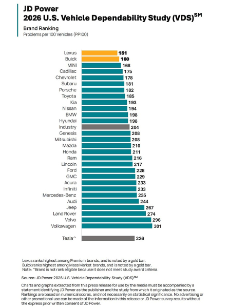 В рейтинге надёжности марок первые два места, как и в прошлом году, занимают Lexus и Buick, однако у обоих лидеров PP100 вырос: у Lexus было 140 — стало 151, у Buick было 143 — стало 160. Британская марка Mini оказалась одной из немногих, кому удалось улучшить свой PP100: было 190 — стало 168, благодаря такому прогрессу Mini заняла третье место в рейтинге.