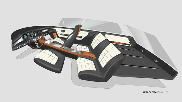 Салон рестомода пока представлен лишь в виде эскизов, а в описании сказано, что классическая атмосфера и даже сиденья будут сохранены, но при этом будут обновлены все материалы отделки — заказчик вправе выбрать кожу, алькантару или скандинавскую шерсть. Переднюю панель можно декорировать натуральным шпоном или алюминиевыми вставками.