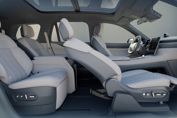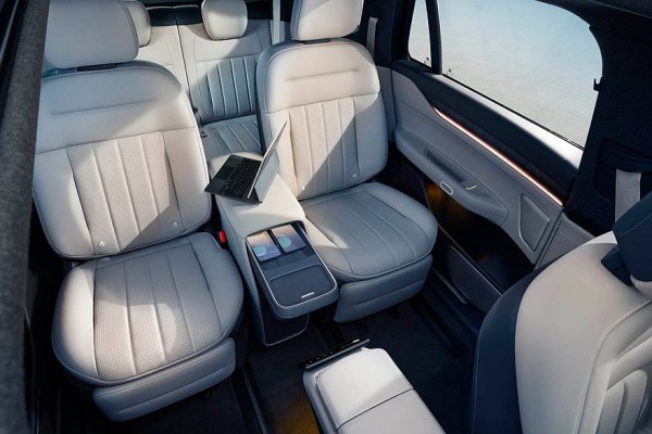 Еще появился трехспицевый руль (у прежнего ES8 – двухспицевый), плюс заменили центральный тоннель и карты дверей. Отвечающие за настройки кресел кнопки отныне расположены непосредственно на дверях. Как и раньше, Nio ES8 будет доступен в шестиместном исполнении. Разумеется, сиденья имеют подогрев, вентиляцию и массажер. В подголовник водительского сиденья встроены динамики. А в потолке спрятан отдельный экран для задних седоков.