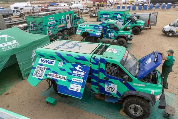 Грузовики «ГАЗ Рейд Спорт» снова предпочли осторожность и не пошли в пески, огибая их по краю. Есть проблемы с перегревом двигателя при колоссальных нагрузках в песках, и такие нагрузки грозят техническим сходом.