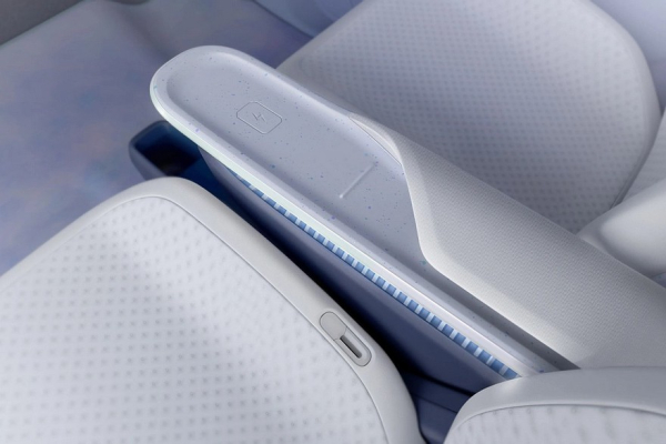 В салоне – лаконичная передняя панель и объединенные в табло виртуальная приборка и тачскрин мультимедийной системы. Под центральными дефлекторами обдува расположен ряд сенсорных кнопок. А между передними креслами установлена «парящая» консоль с площадкой для беспроводной зарядки смартфона.
