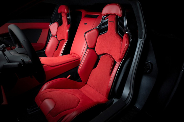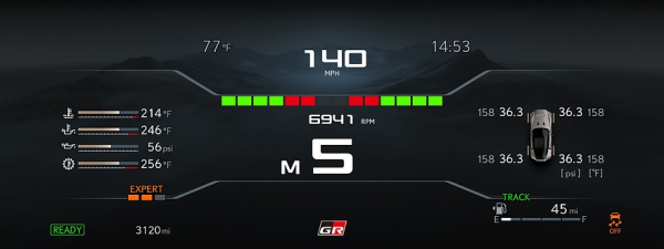 Салон GR GT оформлен предельно лаконично, глазу здесь не за что особенно зацепиться, всё подчинено тщательно выверенной эргономике. Например, мультимедийный экран заметно отодвинут от передней панели и придвинут к водителю для максимально удобного использования, и это единственная сенсорная панель, все остальные органы управления физические. Микроклиматом заведуют крупные качающиеся клавиши, селектор АКП выполнен в виде крупного металлического тумблера. Щиток приборов — электронный, с очень наглядной графикой на гоночный манер, то есть без всяких украшательств. Ковшеобразные кресла водителя и единственного пассажира опущены максимально низко. Педали газа и тормоза напольные и выполнены из металла.