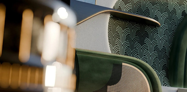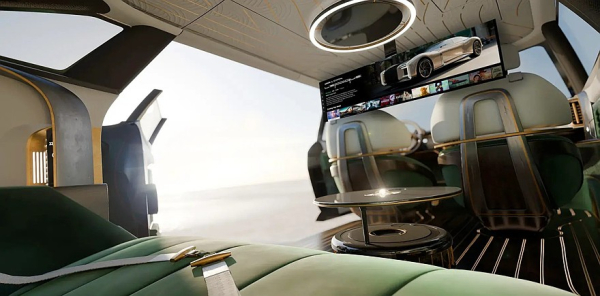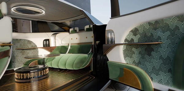 Салон напоминает гостиную роскошной виллы: кресла и задний диван здесь мебельного типа, с деревянным декором и пышной велюровой обивкой. Посадочная формула заявлена как 2+2+2, то есть где-то в салоне предусмотрены два раскладных стульчика. Перед задним диваном имеется столик на ножке, который может перемещаться по салону по круглой орбите. В дверных картах имеются ниши с бокалами для шампанского на четыре персоны. Под потолком подвешен широкий развлекательный экран. Управление светом, микроклиматом и прочими удобствами завязано на искусственный интеллект, понимающий голосовые команды.