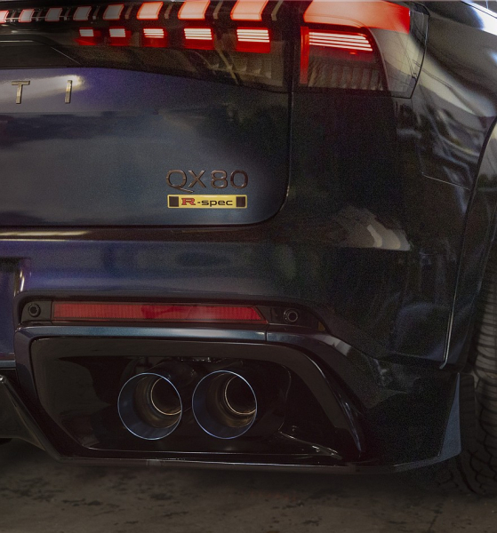 Компания подготовила новую «заряженную» версию Infiniti QX80 R-spec. Пока что японская марка показала всего лишь пару тизеров грядущего «горячего» внедорожника. На них, помимо названия модели, а также, собственно, исполнения, можно разглядеть сине-фиолетовый цвет кузова, а ещё пару круглых патрубков выхлопной системы, расположенных в обрамлении рамки из чёрного глянцевого пластика.