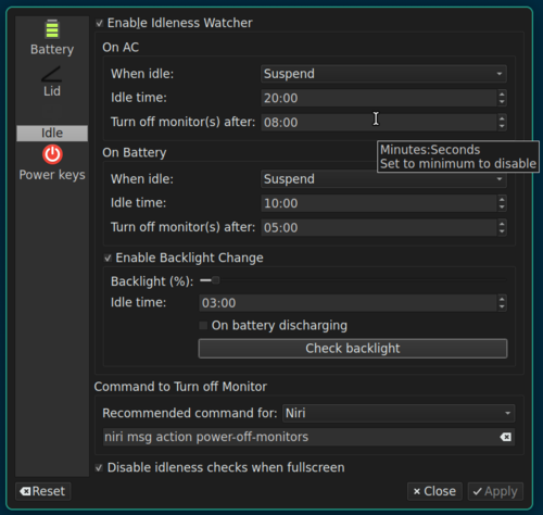 - В LXQt-Powermanagement реализованы раздельные таймауты перевода монитора в спящий режим для автономной работы и для работы от стационарного источника энергии.