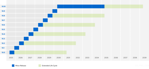 Длительная поддержка для промежуточных выпусков будет осуществляться через релиз. Например, расширенные обновления для майского выпуска RHEL 10.2 будут формироваться до мая 2032 года, для ноябрьского RHEL 10.3 — до мая 2027 года, а для майского RHEL 10.4 — до мая 2033 года. Ветка RHEL 10 в целом будет сопровождаться до 2039 года, ветка RHEL 9 — до 2036 года, а RHEL 8 — до 2033 года.