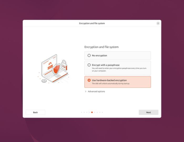 - Расширены возможности по использованию полнодискового шифрования, не требующего ввода пароля разблокировки диска при загрузке, благодаря хранению информации для расшифровки ключей в TPM (Trusted Platform Module). Реализованы возможности для восстановления ключей, применяемых при полнодисковом шифровании на базе TPM. Добавлена поддержка добавления и удаления PIN-кодов или паролей после установки. В конфигуратор добавлена опция для перешифровки диска.