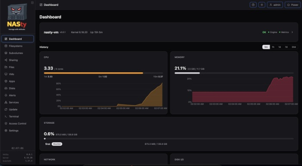 Дополнительно можно отметить выпуск проекта NASty 0.0.3, развивающего дистрибутив для создания сетевых хранилищ (NAS) на основе типового оборудования. Дистрибутив построен на пакетной базе NixOS, использует файловую систему Bcachefs и поддерживает предоставление доступа к файлам через NFS и SMB, а также экспорт блочных устройств через iSCSI и NVMe-oF. Управление осуществляется через web-интерфейс. Размер установочного iso-образа 1.9 ГБ. Наработки проекта распространяются под лицензией GPLv3. Web-интерфейс написан на TypeScript с задействованием фреймворка SvelteKit. Движок для управления хранилищем и системой написан на языке Rust.