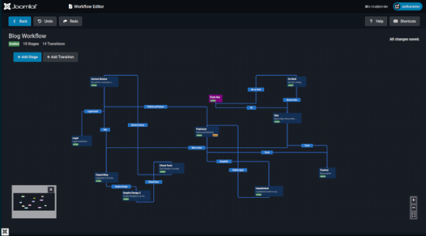 • Реализован визуальный редактор рабочих процессов (Workflow), отображающий процесс утверждения материала в форме интерактивного графа и позволяющий управлять проверкой и доработкой материала перед публикацией с вовлечением рецензентов, редакторов и корректоров.
