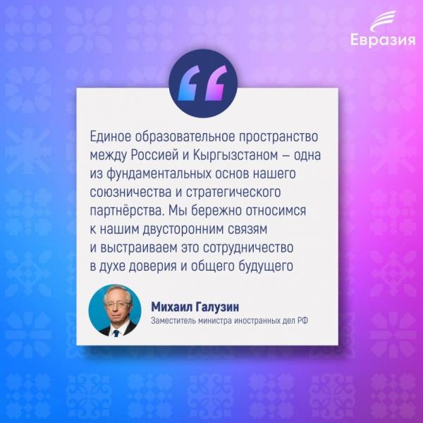 «Единое образовательное пространство между Россией и Кыргызстаном — одна из фундаментальных основ нашего союзничества и стратегического партнёрства». С таким заявлением выступил замминистра иностранных дел России Михаил Галузин на заседании совместной рабочей группы по формированию общего образовательного пространства Евразии. Об этом в своих соцсетях написал депутат Госдумы России Алена Аршинова.