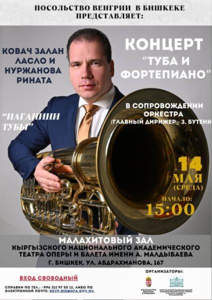 Сегодня, 14 мая, в 15:00 в Малахитовом зале Кыргызского Национального академического театра оперы и балета имени А. Малдыбаева пройдёт уникальный концерт «Туба и фортепиано, в сопровождении оркестра».