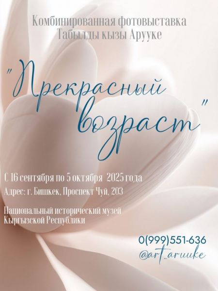 С 16 сентября по 5 октября 2025 года в Национальном историческом музее Кыргызстана (пл. Ала-Тоо, 1, Бишкек) пройдёт фотовыставка «Прекрасный возраст». Проект создан студенткой факультета «Кино и телевидение» КНУКИ им. Б. Бейшеналиевой Арууке Осмоновой-Лобян и объединяет документальное кино и фотографию.