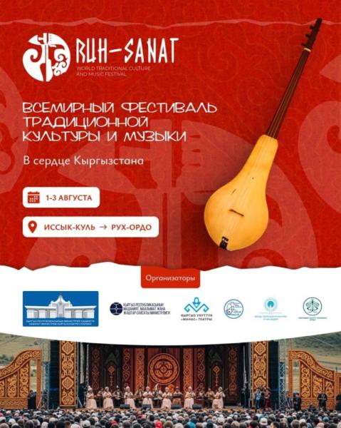 Кыргызстан готовится принять одно из самых масштабных международных событий в сфере культуры — Всемирный фестиваль традиционной культуры и музыки «Рух Санат», который пройдёт с 1 по 3 августа 2025 года в культурно-этнографическом комплексе «Рух Ордо» в городе Чолпон-Ата.