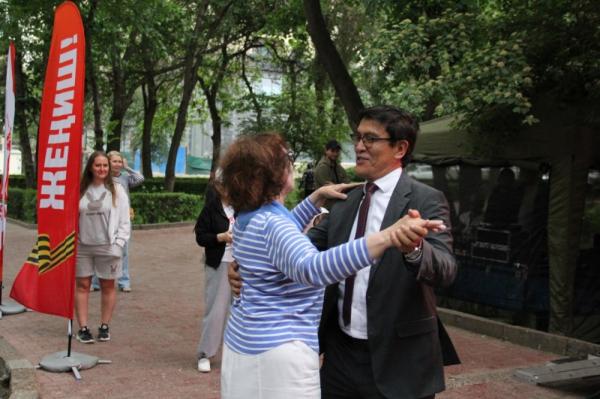 Праздничная программа «День Победы в Русском доме – Бульвар Победы» проходила сегодня в течение всего дня. Русский дом посетили сотни бишкекчан всех возрастов. Для гостей были организованы различные мероприятий: от викторин и мастер-классов – до концертов и художественных выставок.