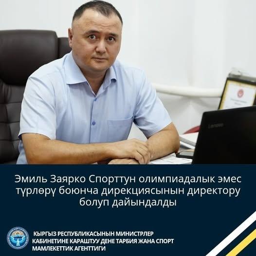 Эмиль Заярко назначен директором Дирекции по неолимпийским видам спорта при Государственном агентстве по делам физической культуры и спорта при Кабинете Министров Кыргызской Республики.