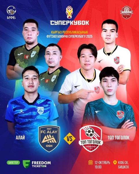 Ассоциация футзала Кыргызстана объявила, что матч за Суперкубок страны по футзалу пройдет 12 октября 2025 года в Бишкеке, сообщает пресс-служба организации.