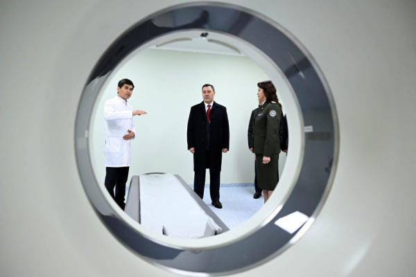 Далее Садыр Жапаров осмотрел кабинеты, оснащенные современным оборудованием, включая магнитно-резонансный и компьютерный томографы, аппараты ультразвуковой диагностики и эхокардиографии, а также палаты, конференц-зал, столовую и спортивный зал.