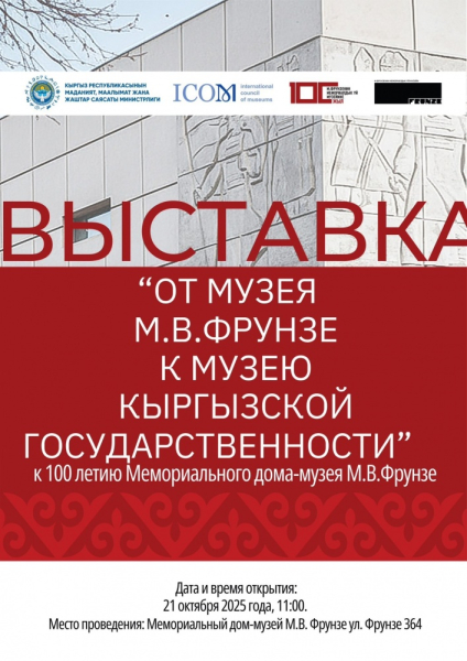 21 октября 2025 года в 11:00 часов в атриуме Мемориального дома-музея М. В. Фрунзе состоится торжественное открытие выставки, посвященной 100-летию первого музея в Кыргызстане — музея Михаила Фрунзе. Об этом сообщает пресс-служба Министерства культуры КР.
