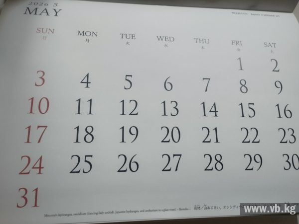 1 мая приходится на праздничный период, в связи с чем кыргызстанцев ждут продолжительные выходные, которые с учётом календарных дней продлятся до 10 мая. Таким образом, на текущей неделе жители страны отработают четыре дня с 27 по 30 апреля.