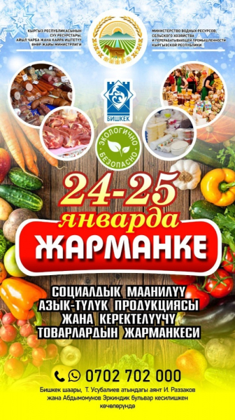 Министерство водных ресурсов, сельского хозяйства и перерабатывающей промышленности КР сообщает, что во всех областях республики, включая город Бишкек, организована регулярная работа ярмарок местных производителей, фермеров и ремесленников. Мероприятия по реализации социально значимых товаров продлятся до июня 2026 года.