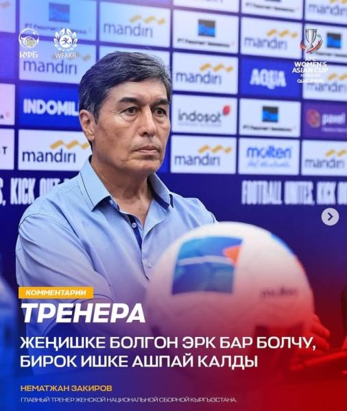 После заключительного матча отборочного этапа Кубка Азии-2026 главный тренер женской сборной Кыргызстана по футболу Нематжан Закиров и игрок команды Нагима Туралиева дали комментарии на пресс-конференции.