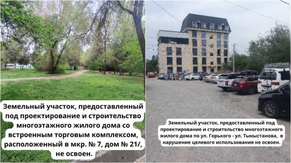 Земельный участок, предоставленный под проектирование и строительство многоэтажного жилого дома с магазином и подземным паркингом в 7 мкр по улице Юнусалиева, не освоен.