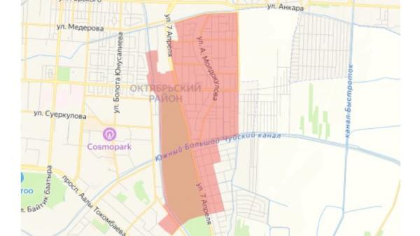 — квадрат: ул. Карадаринская — ул. Ахунбаева – 7 Апреля — граница между мкр. Улан-1 и Улан-2;