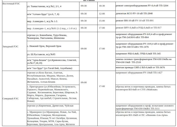 Бишкекское предприятие электрических сетей опубликовало перечень участков техобслуживания электросетей на 9 июня в городе Бишкек с возможным перерывом в электроснабжении.