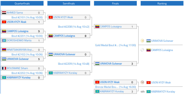 Усөн кызы стартовала со стадии 1/4 финала, где победила спортсменку из Египта Сама Ахмед. В полуфинале кыргызстанка уступила представительнице Венесуэлы Луисайнья.