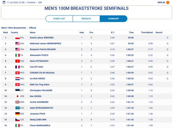 16 июля стартовали состязания в заплыве на 100 метров брассом, где были заявлены 56 спортсменов.