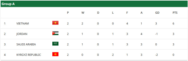 После двух туров в турнирной таблице лидирует Вьетнам — 6 очков. Далее идут Иордания и Саудовская Аравия, у которых по 3 очка. Кыргызстан с нулем в графе «набранные очки» замыкает таблицу.